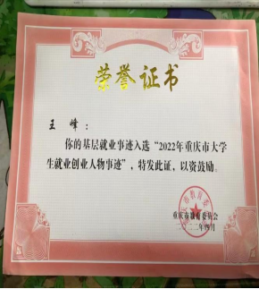 王峰,男,共青团员,2021届烹调工艺与营养专业毕业生,现就职于南川区大观镇,担任镇团委副书记,第十五次区团员代表大会代表等。在校期间,曾担任全国百佳体育公益社团“守望天使团队”第六任理事长,带领团队为200余名残障儿童提供1000余小时志愿服务,并荣获“第五届中国青年志愿服务项目大赛银奖”、“首届重庆市残疾人志愿服务项目大赛铜奖”等荣誉。