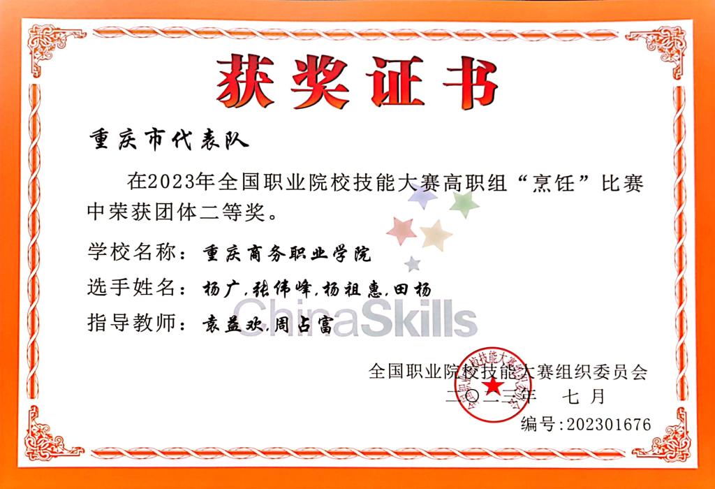 在比赛过程中,选手们胸有成竹,全力以赴,用良好的职业素养和过硬的专业技能弘扬精益求精的工匠精神,充分展现出烹饪学院学子的专业素养和青春风采。参赛团队突出的表现得益于学校常态化技能优才的培养机制、技能教学过程的精细化管理以及学校党政强大的支持和后勤保障力量,也离不开周占富、袁益欢等指导教师团队言传身教、悉心指导和参赛团队的刻苦努力、精于专研。