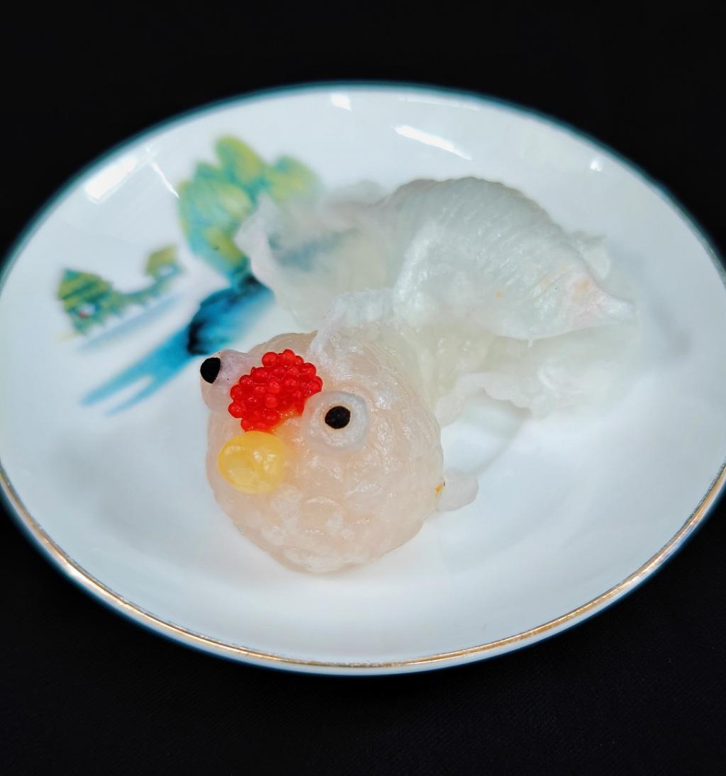 “鱼戏莲叶东,鱼戏莲叶西,鱼戏莲叶南,鱼戏莲叶北。”此点选用澄面和虾仁为食材,经过揉搓、包捏做成金鱼形,观之形态逼真,食之口感滑爽。寓意新人婚后生活富足、吉庆顺意。