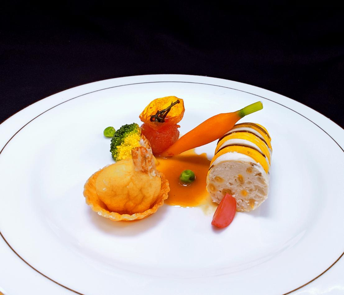 “雀屏中目郞才俊,宏安齐眉女貌妍;琴瑟和鸡家美满,百年偕老永团圆”。此菜采用跑山鸡作为主料,经过打糁后运用中西式烹调技法,卷筒成型,辅配鱼香汁,色彩绚丽;祝福一对新人心连心,享受浓浓的新婚幸福,情意像蜜一样甜美。