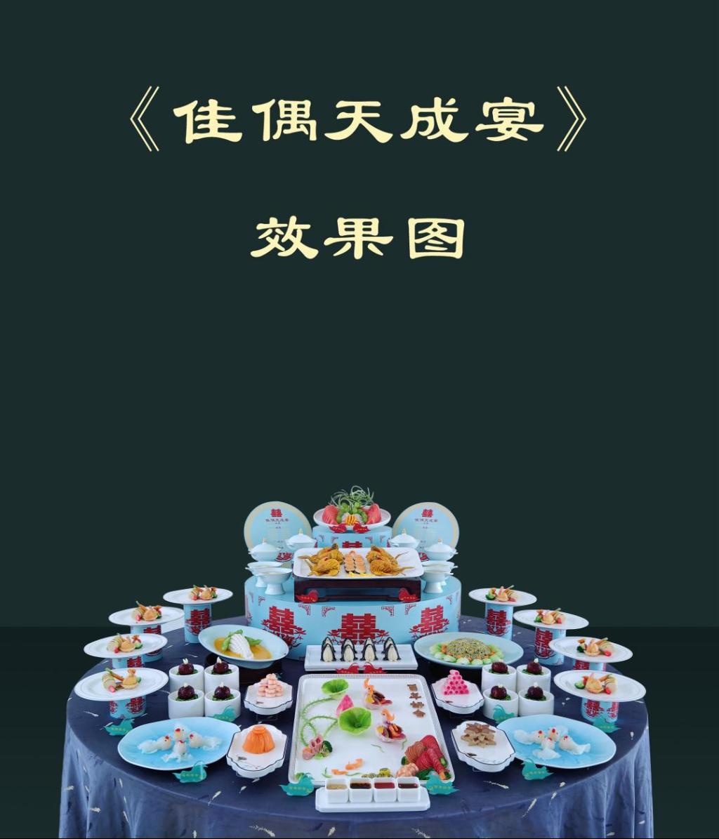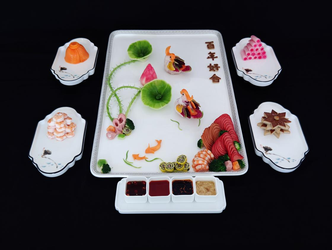 “叶有清风花有露,池笼荷罩鸳鸯侣。”冷菜以中心主题来命名,一来直接点题,突出本桌宴席的核心主题文化。新婚佳偶向往的生活是一种家的味道,既有夫妻和睦、父母健康的情感,也有家业丰收的生活状态。此冷盘的设计和造型,正是借用婚庆元素和传统美学——荷塘下、花卉艳、绿水游、鸳鸯戏的一种和谐美好的家庭景象。希望通过此冷盘能将宾客带入和谐家园的场景中去,使人心情愉悦、祝福连连。