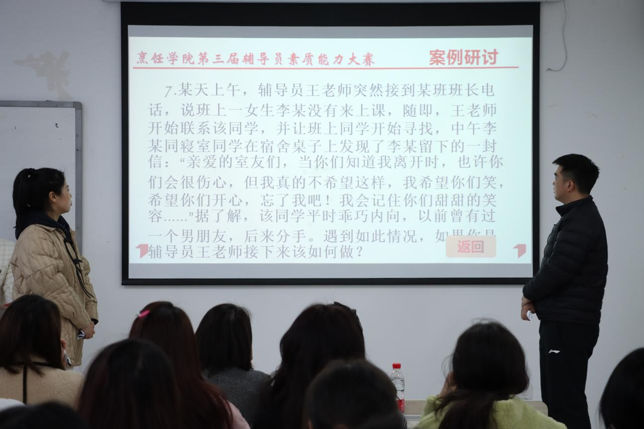 比赛分为笔试、案例分析、谈心谈话三个环节,主要考察辅导员对学生特征、学生成长成才规律的了解和把握程度,综合运用理论分析问题、研判问题、解决问题、应急突发事件处理及教育引导等多方面的工作能力。经过激烈的比拼结合初赛笔试成绩最终钱籽霖获得一等奖刘媛媛获得二等奖周淑金和钟仕毅获得三等奖