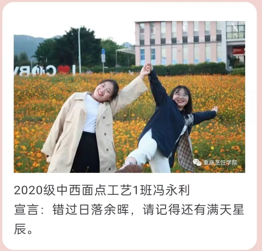 在“你笑起来真好看”的活动中,同学们用相机拍下了自己最阳光、最灿烂的微笑,还附上了生活感悟。通过“重商烹饪学院”微信公众号平台网络投票最终评出10名最具人气微笑奖。同学们在活动中宣传积极、乐观、阳光的健康心理状态,让更多的同学与自己一起发现美、寻找美。
