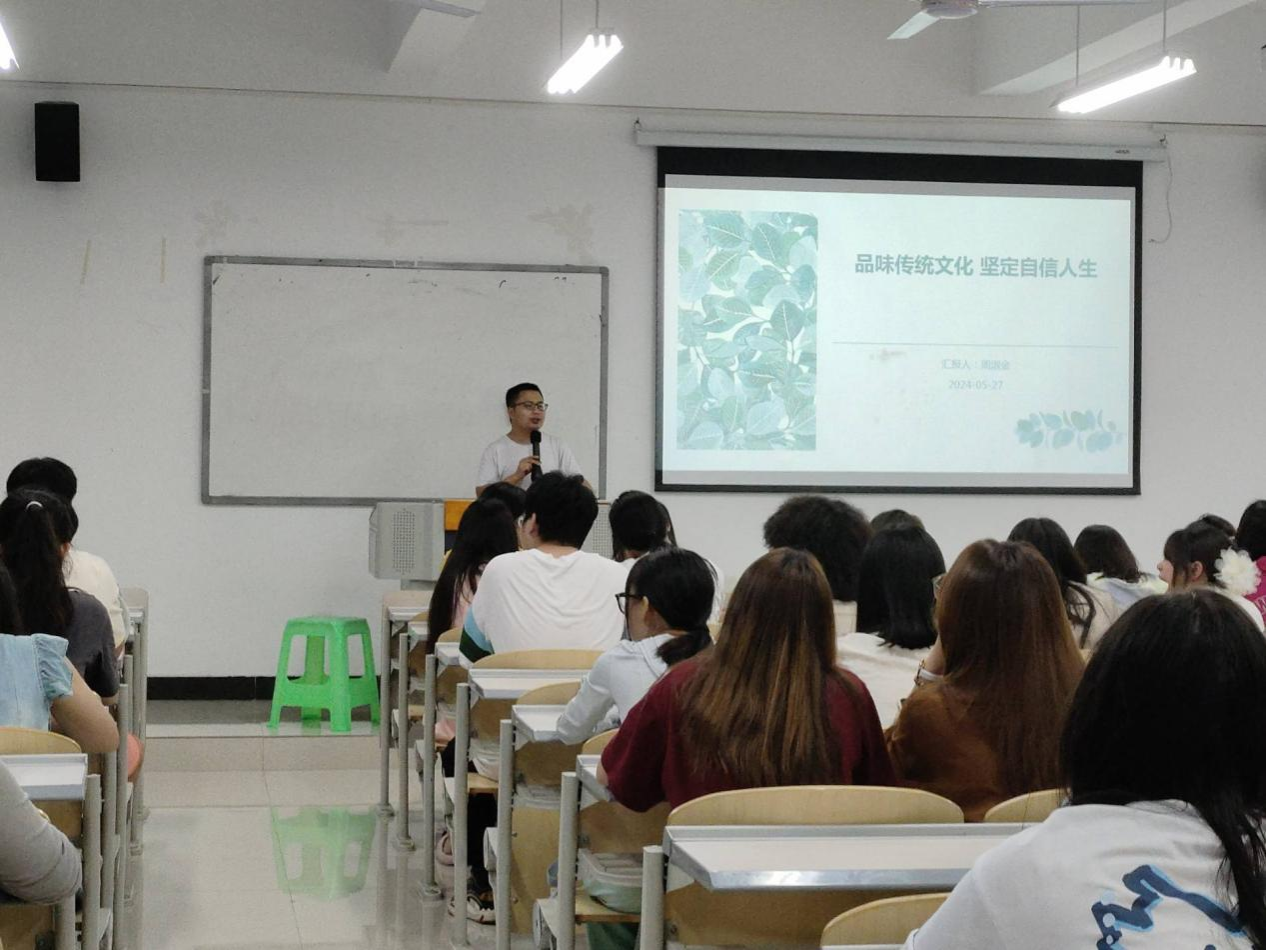 (图/文:何佳佳)为落实立德树人的根本任务,加强对学生们的思想政治教育引领,弘扬中华优秀传统文化,帮助学生树立坚定的民族自觉和文化自信,2024年5月,烹饪学院各教学班在辅导员的精心备课和统筹安排下,开展了以“弘扬传统文化 坚定自信人生”为主题的主题班会。