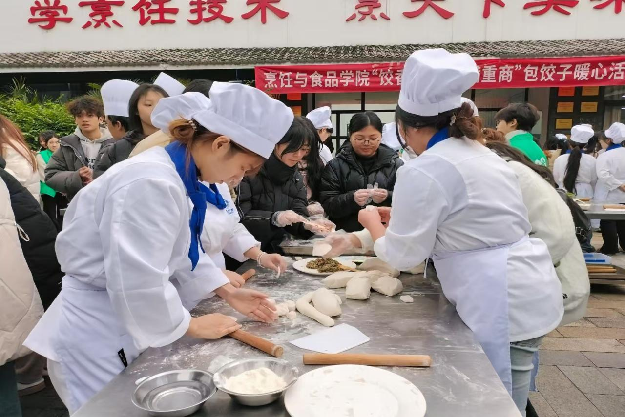 2024年12月11日,在烹饪实训中心门口,烹饪科学技术科普社联合美食研学社开展了“饺香四溢 情满重商”包饺子暖心活动。活动吸引了全校500余名学生和青年职业技术学院30余名泰国留学生参加。