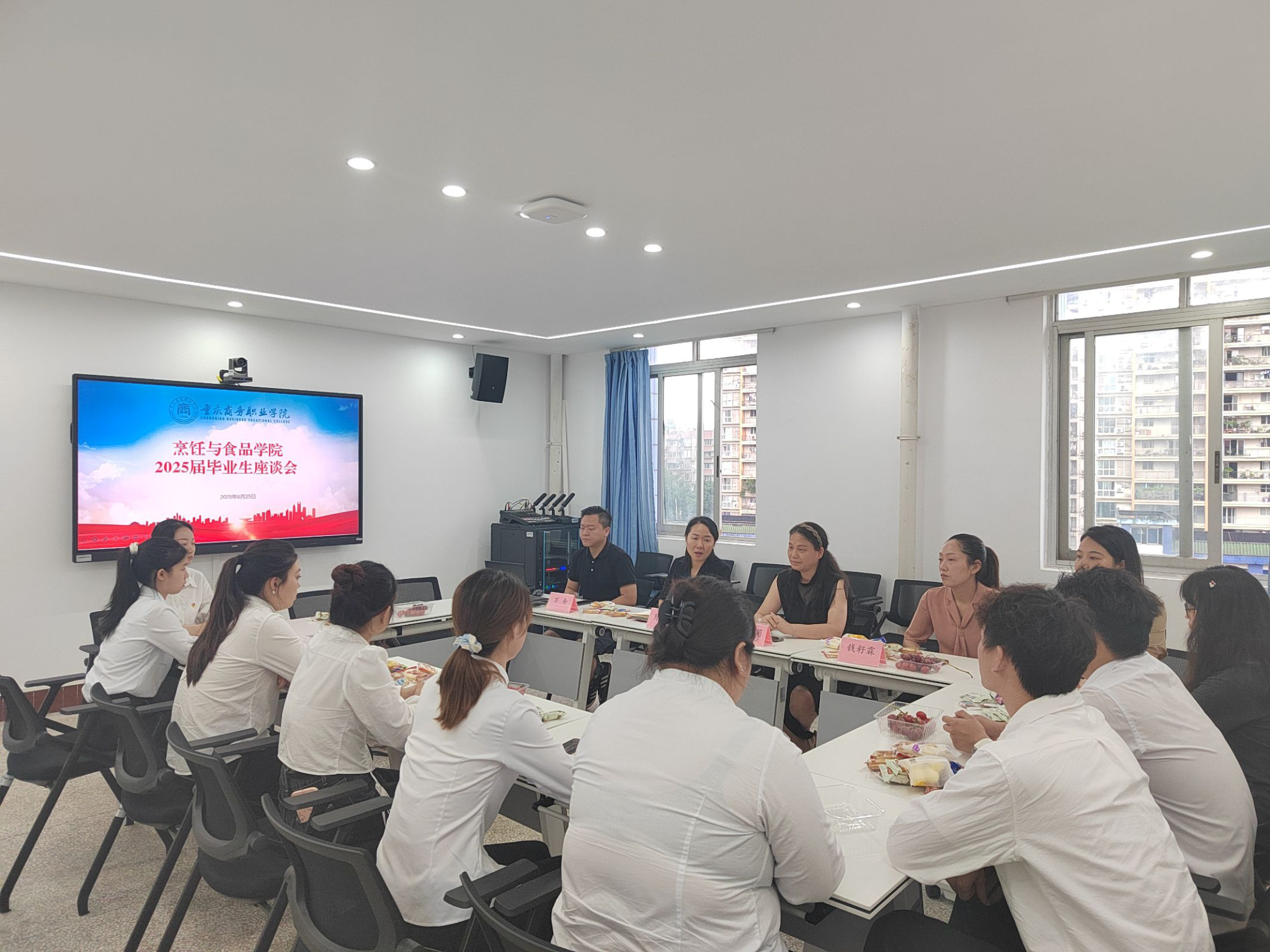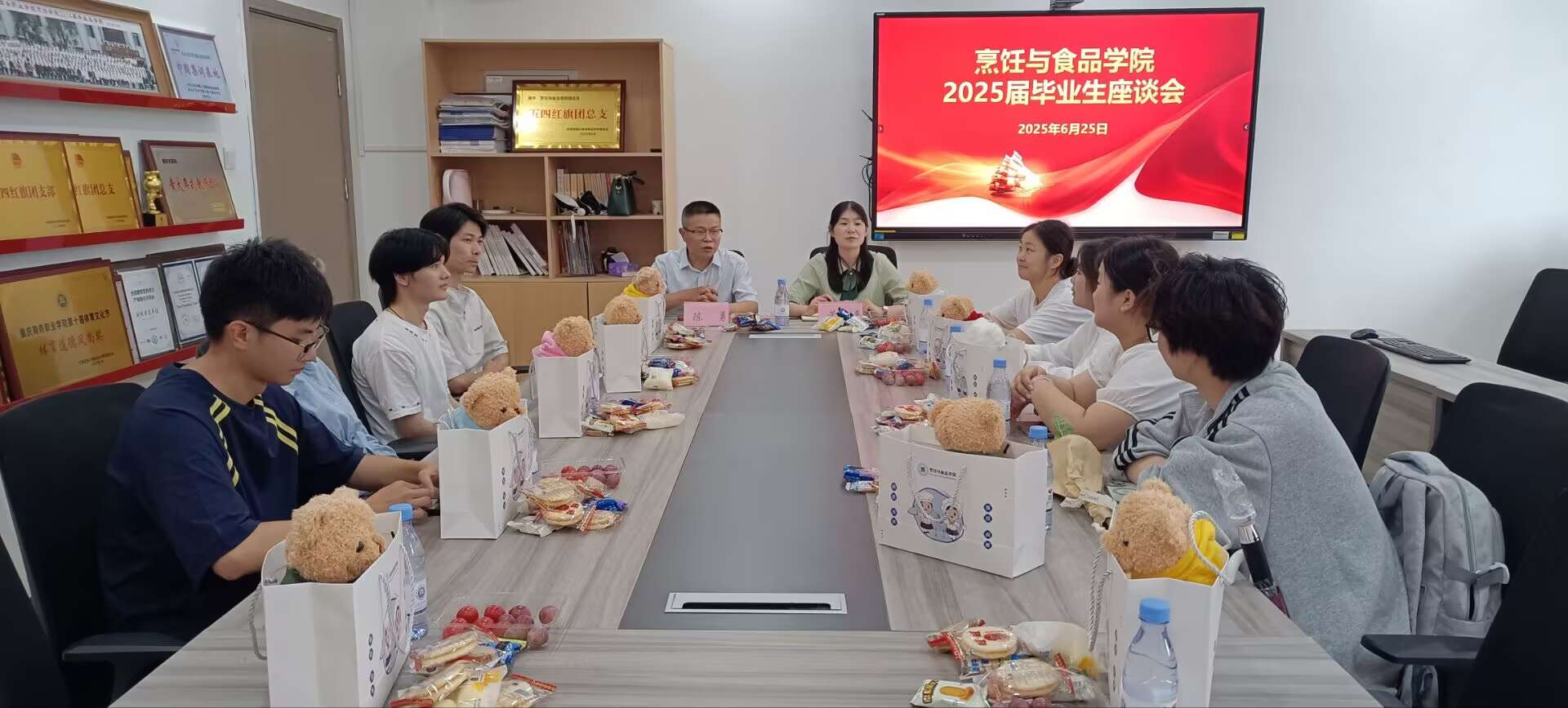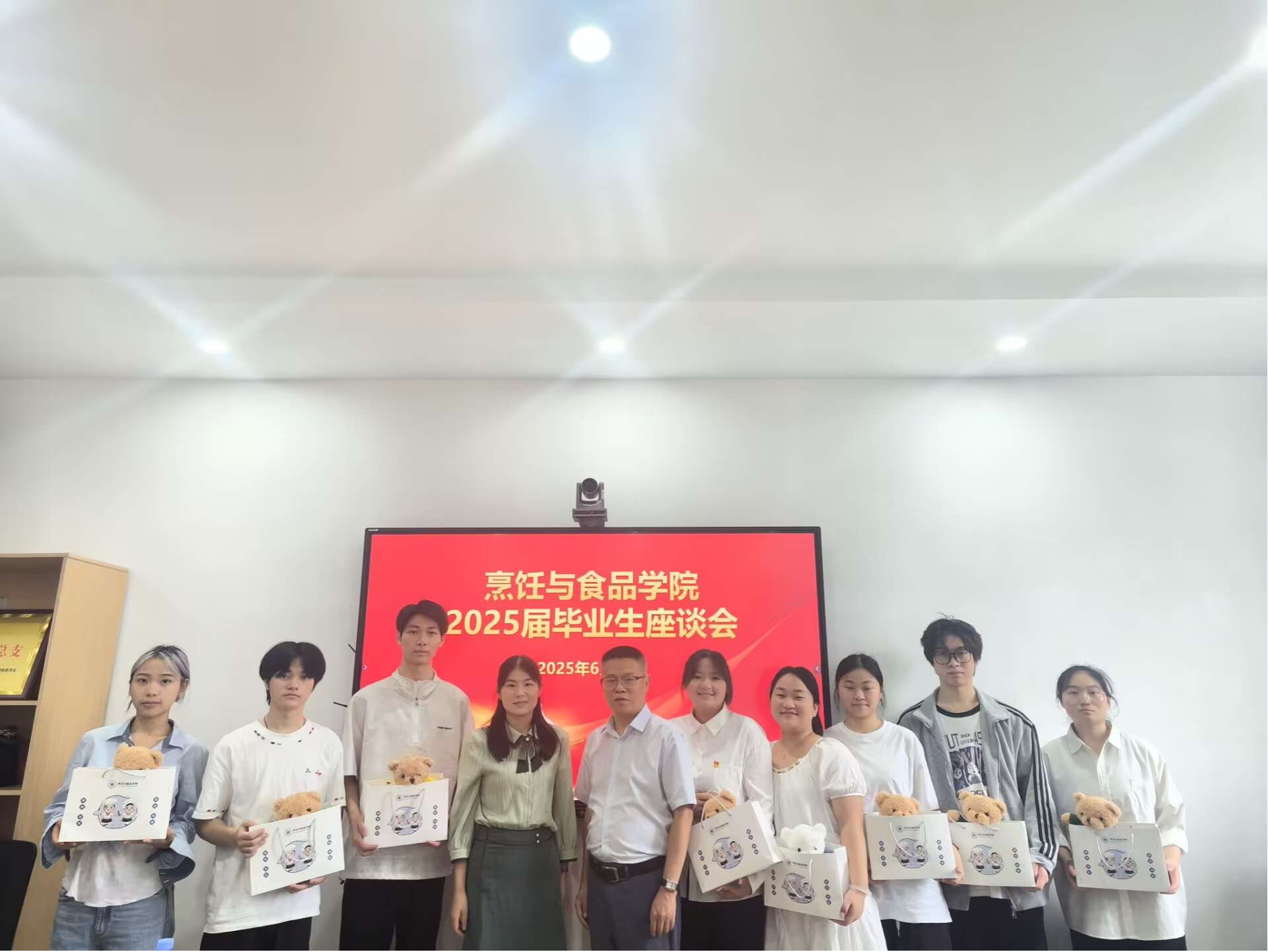 为深入了解毕业生的学习、生活及就业情况,加强学院与毕业生之间的沟通与交流,6月25日,烹饪与食品学院成功举办了2025届毕业生座谈会。学院党总支副书记陈小容、副院长陈勇、李晓菊,学团办主任、毕业班辅导员以及2025届毕业生代表齐聚一堂,共同回顾大学时光,展望未来发展。