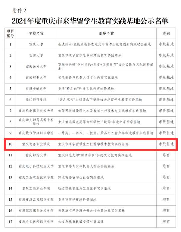 (图/文 任红近日,重庆市教育国际交流协会公布了2024年度来华留学生教育实践基地名单。我校“重庆市来华留学生烹饪科学技术教育实践基地”入选“重庆市来华留学生教育实践基地”,成为全市唯一聚焦烹饪技术国际化的职教平台。
