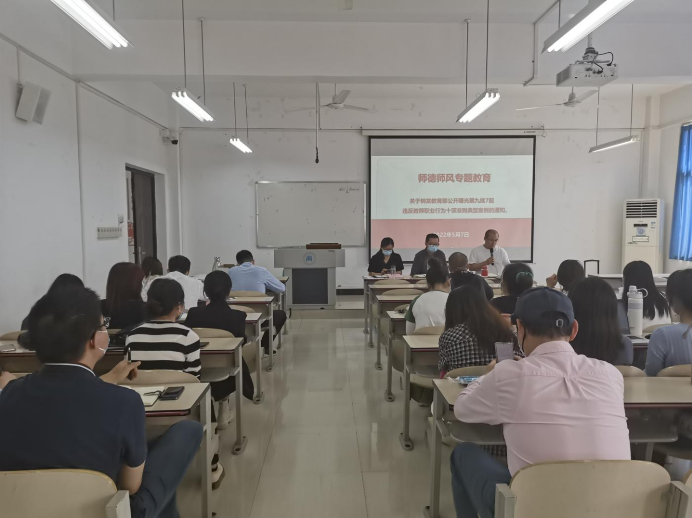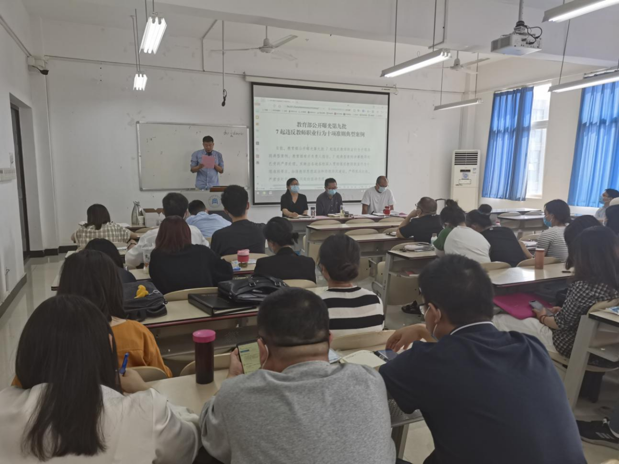 会上全体教职工在党总支纪检委员赵超超的带领下,集中学习了教育部公开曝光第九批7起违反教师职业行为十项准则典型问题,用身边发生的典型案例教育全体教职工,以案为镜、以案为戒,坚守为党育人、为国育才初心,锤炼教育报国之志,树立良好师德师风,率先垂范、以身作则,努力做精于“传道授业解惑”的“经师”和“人师”的统一者,做学生为学、为事、为人的大先生。党总支书记马金海同志强调师德是教师的灵魂,是立教之本,兴教之源。要求全体教师不忘初心,立德树人,争做新时代的“四好教师”。开展师德师风学习教育活动,有利于逐步打造一支风清气正、师德高尚、素质全面、业务精湛、人民满意的教师队伍,竭力构建师德师风建设长效机制。