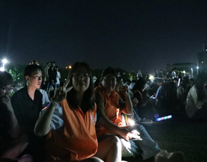 夜跑结束后,同学们聚集运动场草地区域,挥舞着手中的闪光灯,配合音乐大声歌唱青春的旋律,享受着音乐表演带来的欢乐。音乐的声音回荡在校园中,现场洋溢着年轻人的活力和朝气,彰显了大学校园的蓬勃生机和校园文化的多样。