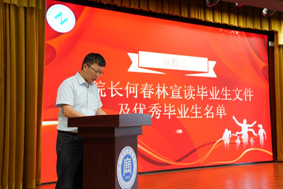 副院长何春林老师宣读了学校毕业生文件及优秀毕业生名单。他希望同学们保持学习的热情和进取的精神,打造德技并修的高素质高技能人才。