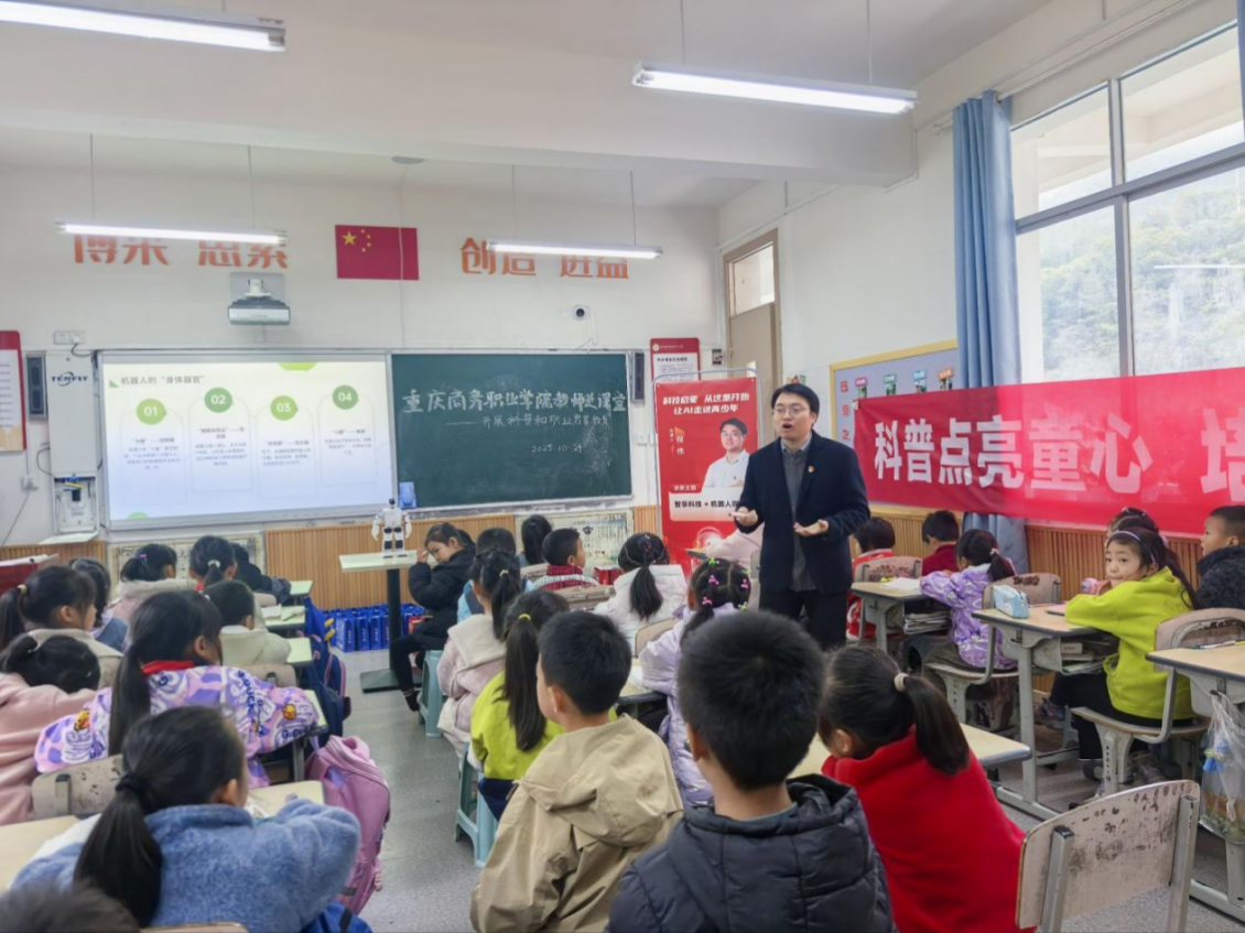 10月25日,重庆商务职业学院人工智能学院党总支部组织的“党员科普服务队”带着智能机器人、少儿编程等教具走进校园,一场以“科普点亮童心、培育未来栋梁”为主题的科普教育活动正在这里热烈开展。从智能机器人互动演示到简易编程实践操作,从科普课堂到职业启蒙,来自职业院校的优质教育资源让这所位于大巴山区的乡村小学焕发出生动的教育活力。