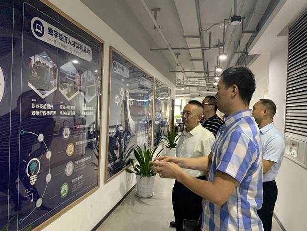 随后参观集团子公司重庆华龙网文化实业发展有限责任公司行业发展时,谭勇一行对产教融合版块中数字经济产业学院、人才实训基地和高技能实训基地现状进行了了解,对相关专业、人才、岗位、待遇、环境、成长等内容进行了详细而深入的调研。