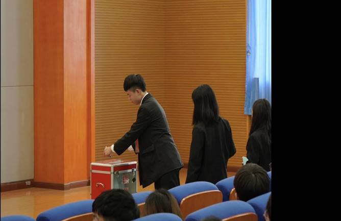 随后,休会。人工智能学院第一次团员代表大会正式会议开始。张郑同学作《共青团工作报告》、胡雨欣同学作《学生会工作报告》,在审议通过《重庆商务职业学院人工智能学院第一次团员代表大会选举办法》之后,由42名团员代表通过差额选举以无记名投票方式,民主选举并产生了人工智能学院第一届团总支委员会委员。最后,以奏唱《团歌》谢幕。