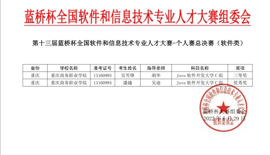 6月28日,第十三届蓝桥杯全国软件和信息技术专业人才大赛全国比赛成绩公布,重庆商务职业学院人工智能学院美和易思校企共建专业不断突破,喜获佳绩!由人工智能学院大数据教研室主任吴迪与美和易思校企共建专业胡华老师率领两位省赛中突围的学子,在全国大赛中斩获JAVA C组国赛三等奖1个优胜奖1个!