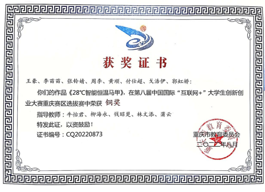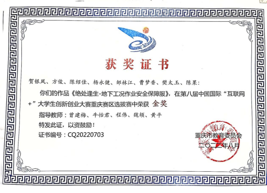 2022年8,由教育部举办的第八届中国国际“互联网+”大学生创新创业大赛全国总决赛在重庆大学落下帷幕。据悉,本届“互联网+”大学生创新创业大赛重庆赛区全市共有80余所高校14万3037个项目报名参赛,参赛选手超过65万人次,参选项目及人数均创历史新高。我院两个项目在本次比赛中表现优异,“绝处逢生—地下工矿作业安全保障服”项目荣获重庆赛区职教赛道金奖,“28度恒温马甲”项目荣获重庆赛区职教赛道铜奖,同时我院曾建梅、牛怡君、程伟三位指导老师荣获重庆赛区职教赛道“优秀创新创业导师”荣誉称号。刷新了我校在重庆赛区的最好成绩。