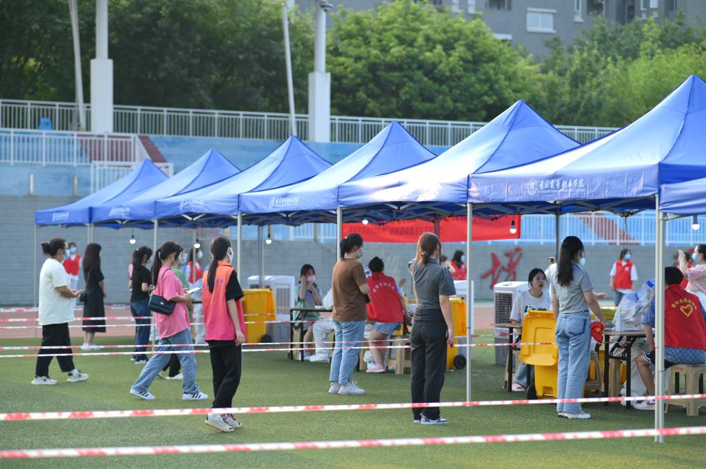 志愿者除了迎接新生志愿服务工作,还承担核酸检测工作,9月12日、9月13日、9月14日连续三天,由志愿者组织所有返校新生在操场有序进行核酸筛查,其中,志愿者们分为三组,一组在每栋寝室楼道与操场维持秩序,一组进入操场的空地进行引导和指示,一组在核酸检测完毕后,疏导大家有序返回宿舍。