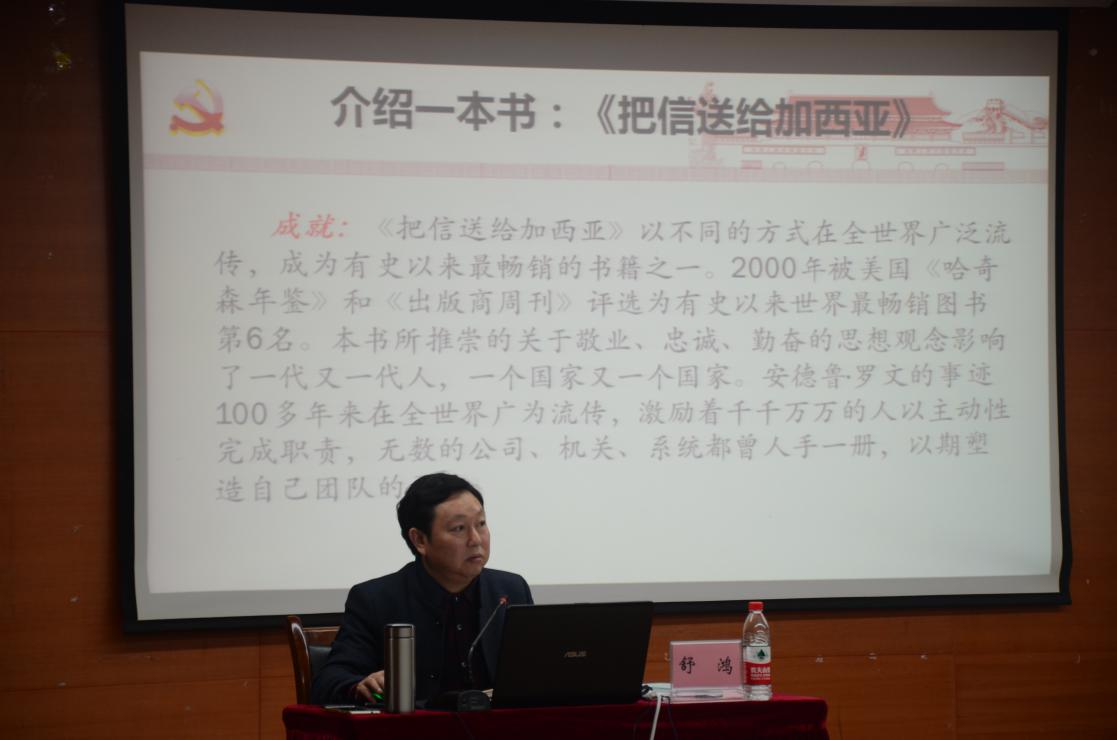 2017年12月7日晚,副院长舒鸿在学生活动中心320为学校第九期团校暨“青年马克思主义者培养工程”骨干培训班作了题为“用理想信念明灯点亮新时代的青春”的讲座。团委老师、第九期青马班全体学员、团学社干部等300余人聆听了讲座。