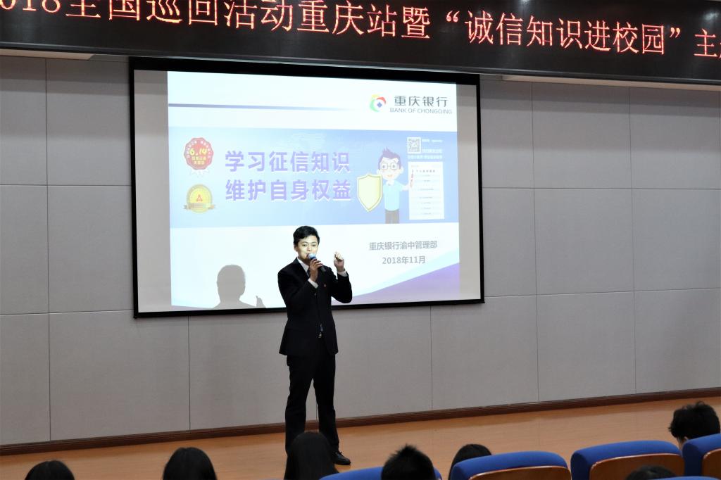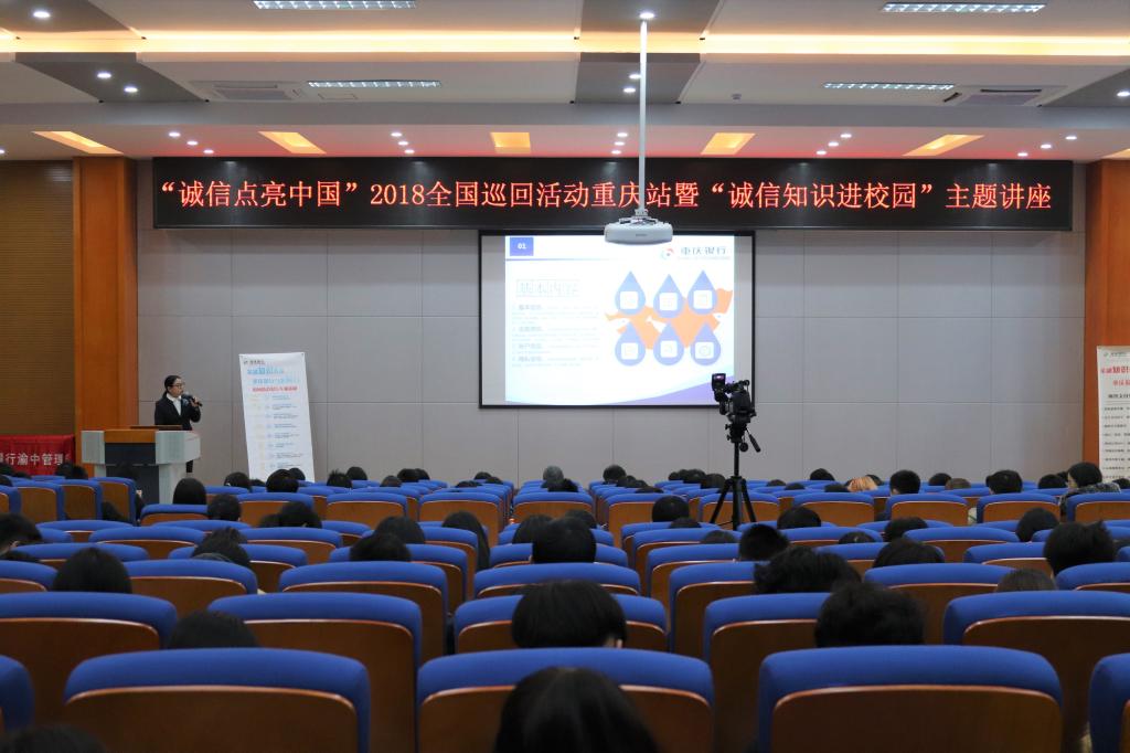 为深入学习贯彻习近平新时代中国特色社会主义思想和党的十九大精神,全面贯彻落实团十八大会议精神,进一步拓宽诚信知识宣传的深度和广度,切实增强青年学生金融安全意识,帮助同学们形成健康的信用消费习惯,11月29日,由共青团重庆市委、中国人民银行重庆营管部主办,重庆商务职业学院、重庆银行渝中管理部承办的“诚信点亮中国”——诚信知识进校园专题讲座在我校第二学术报告厅举行,280余名师生参加了此次活动。