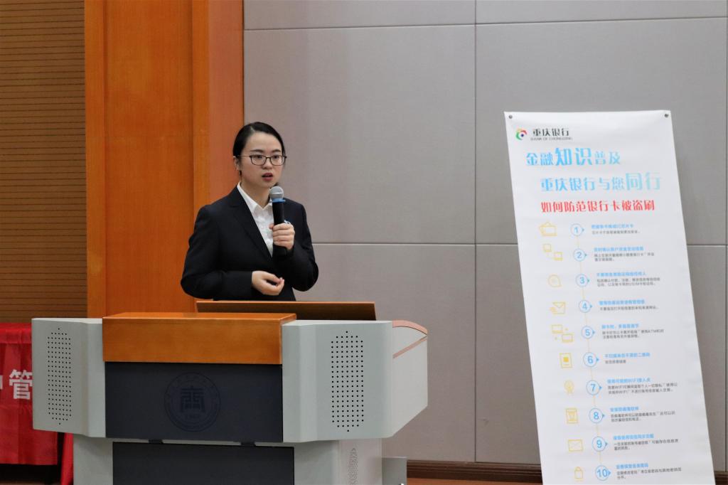 重庆银行的内训师通过对个人信息安全知识、给未来的自己等一系列讲解为同学们讲授了国家信用政策法规、信用知识和典型案例,形象生动引导广大青年学生珍惜个人信用记录;同时,向同学们普及金融常识,针对非法集资、电信诈骗和银行卡盗刷的防范技巧以及有效防范校园贷等金融诈骗知识,提高了同学们风险防范意识,形成建设诚信校园的思想共识。讲座内容贴合学生生活实际,寓教于乐。