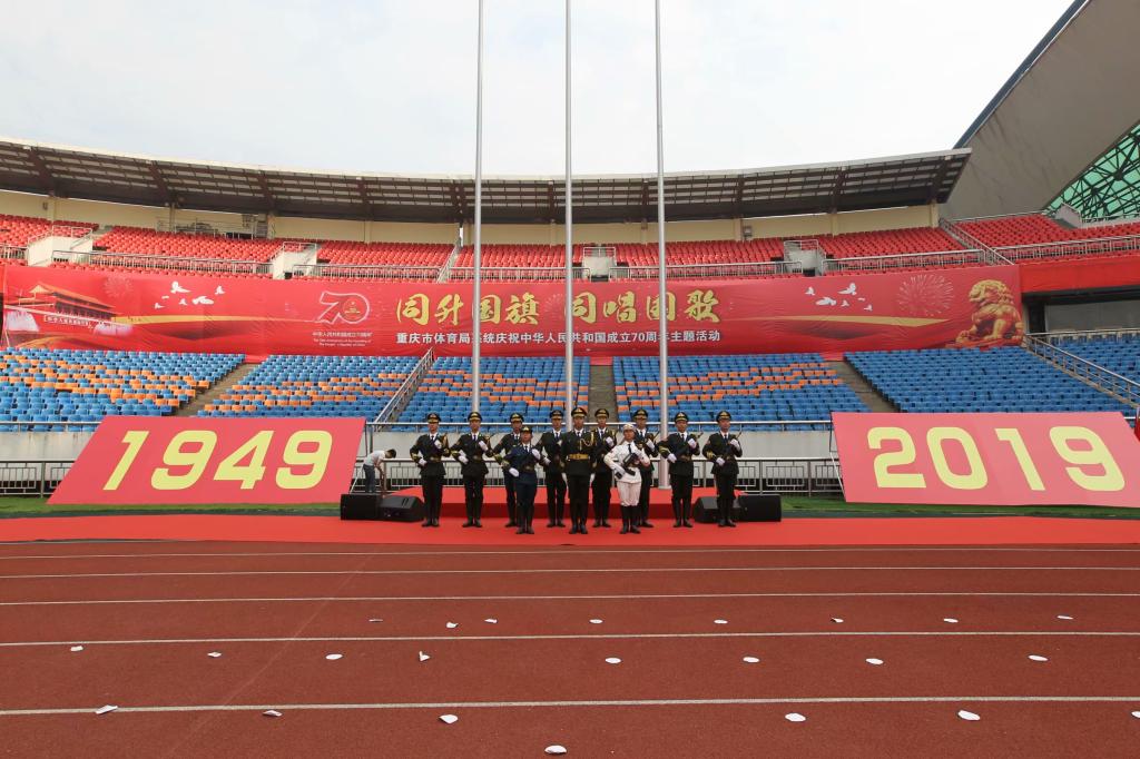 2019年9月30日上午,我校国旗队受邀参加重庆市体育局庆祝新中国成立70周年“同升国旗,同唱国歌”主题活动,在重庆奥体中心升起鲜艳的五星红旗。这是我校国旗队自建立以来首次受邀外出参加大型活动,获得市体育局的一致好评。