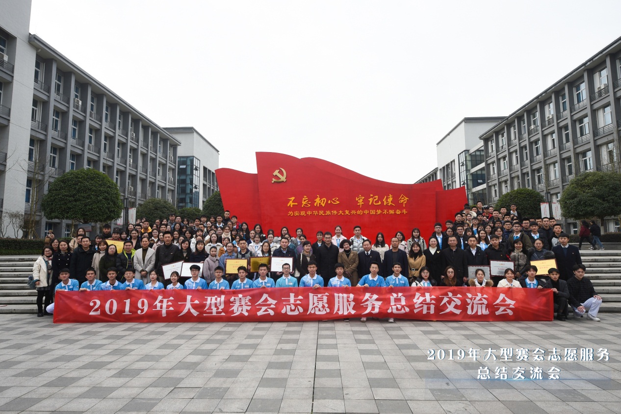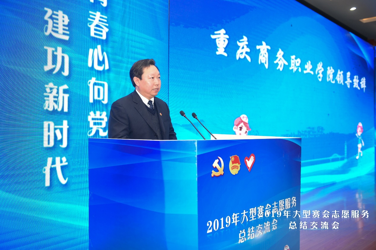 2019年12月26日下午,重庆市2019年大型赛会志愿服务工作总结交流大会在重庆商务职业学院举行。团市委、市经信委、市政府外办、市地方金融监管局、市科协、市志愿服务工作指导中心、沙坪坝区委等有关负责同志及各高校优秀志愿者代表共计300余人参加本次大会。
