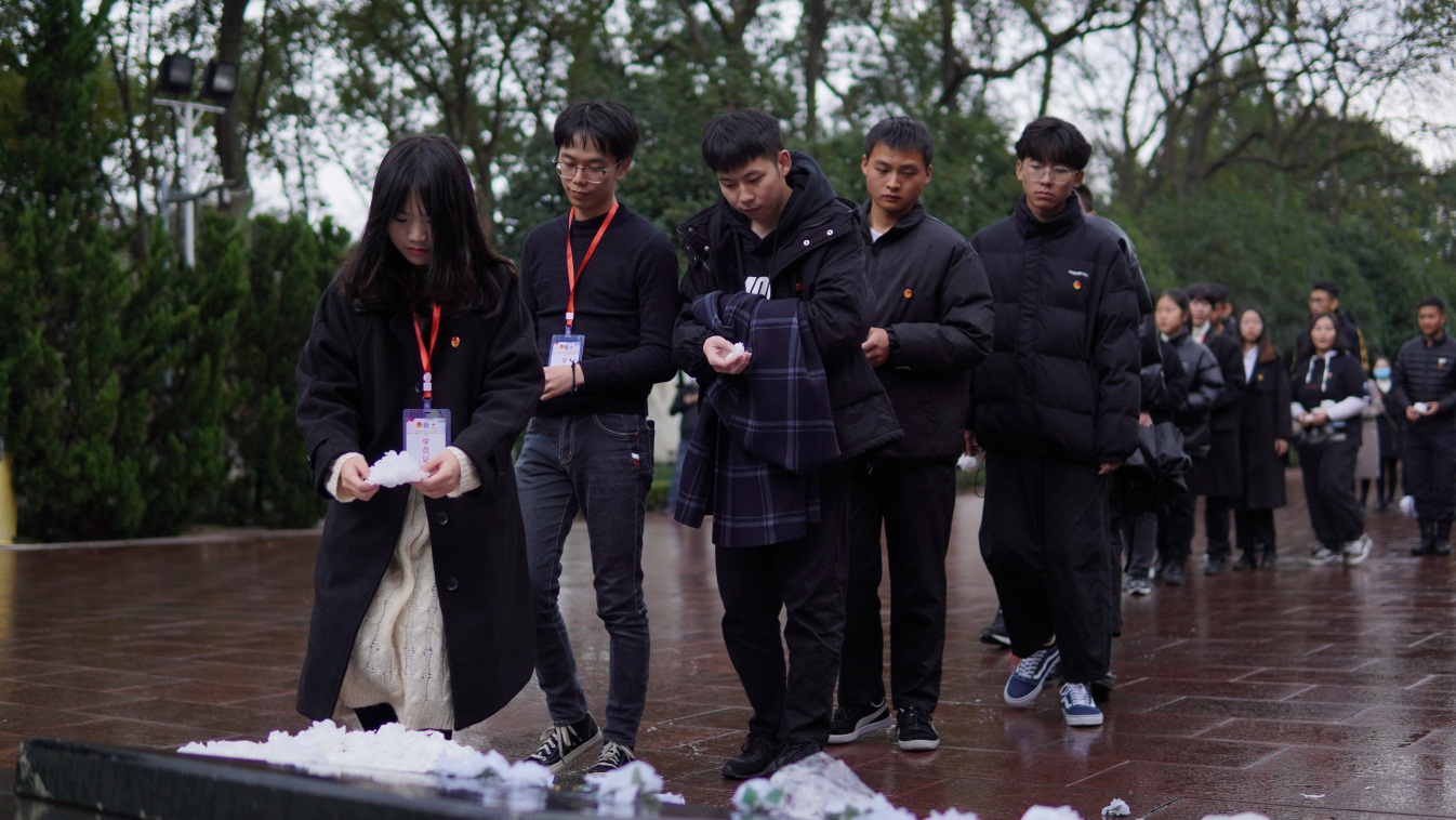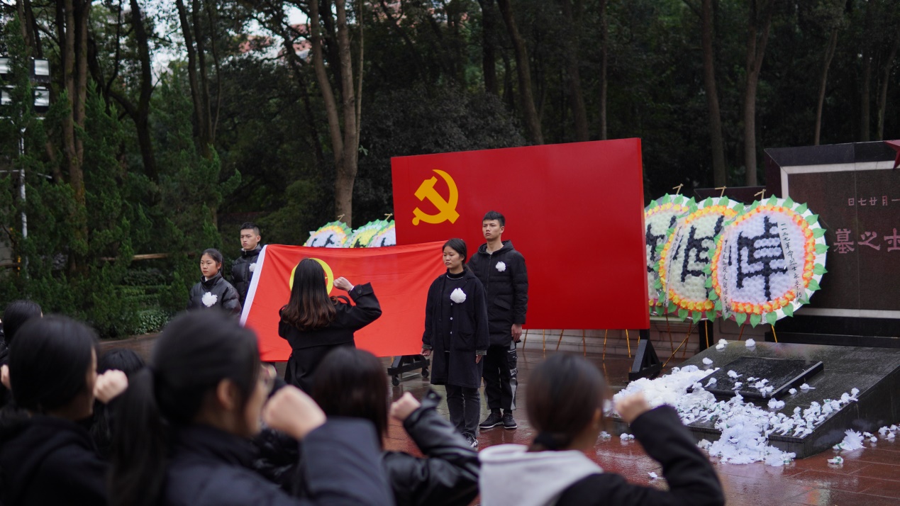 青年思政教师顾志飞讲述了“11.27”渣滓洞大屠杀事件和烈士生平事迹,与同学们一起重新回味红岩英烈们走过的光辉足迹。现场庄严肃穆,全体师生垂首而立,集体默哀,并向烈士敬献小白花,表达对先烈们沉重的哀悼。随后,全体青年师生在团旗下重温了入团誓词。