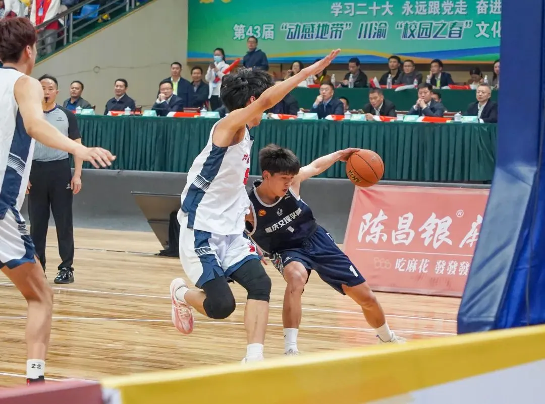 开幕式上,在3000多名观众的注目下,“跃动青春”篮球邀请赛正式开赛,来自北京大学和重庆文理学院的两支球队激烈对战。