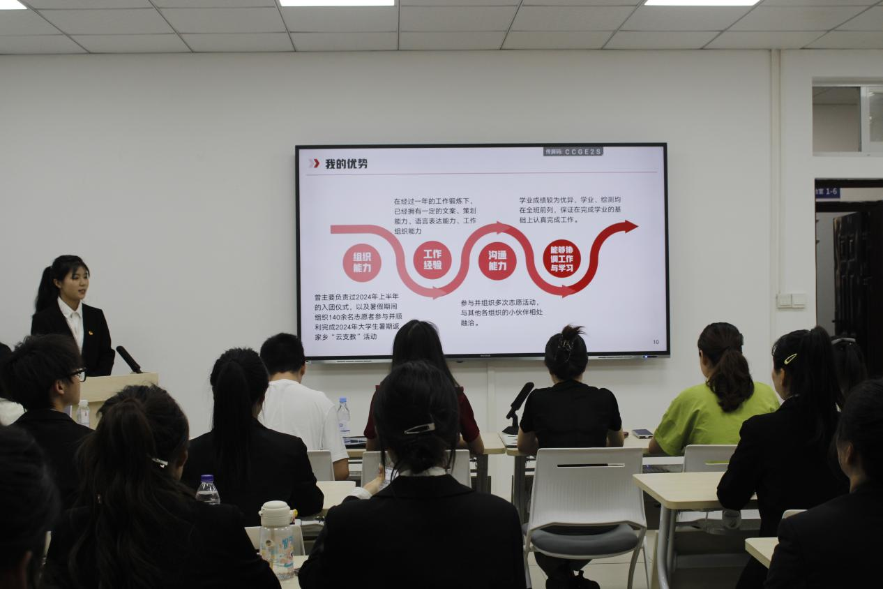 为深入学习贯彻党的二十届三中全会精神和习近平总书记关于青年的重要讲话精神,进一步加强学生干部队伍建设,充分发挥学生组织的桥梁、纽带作用。校团委于2024年9月25日12:40点在缙云社区成功开展2024—2025学年校级团学社学生骨干选聘大会。校团委老师及各团学骨干参加。
