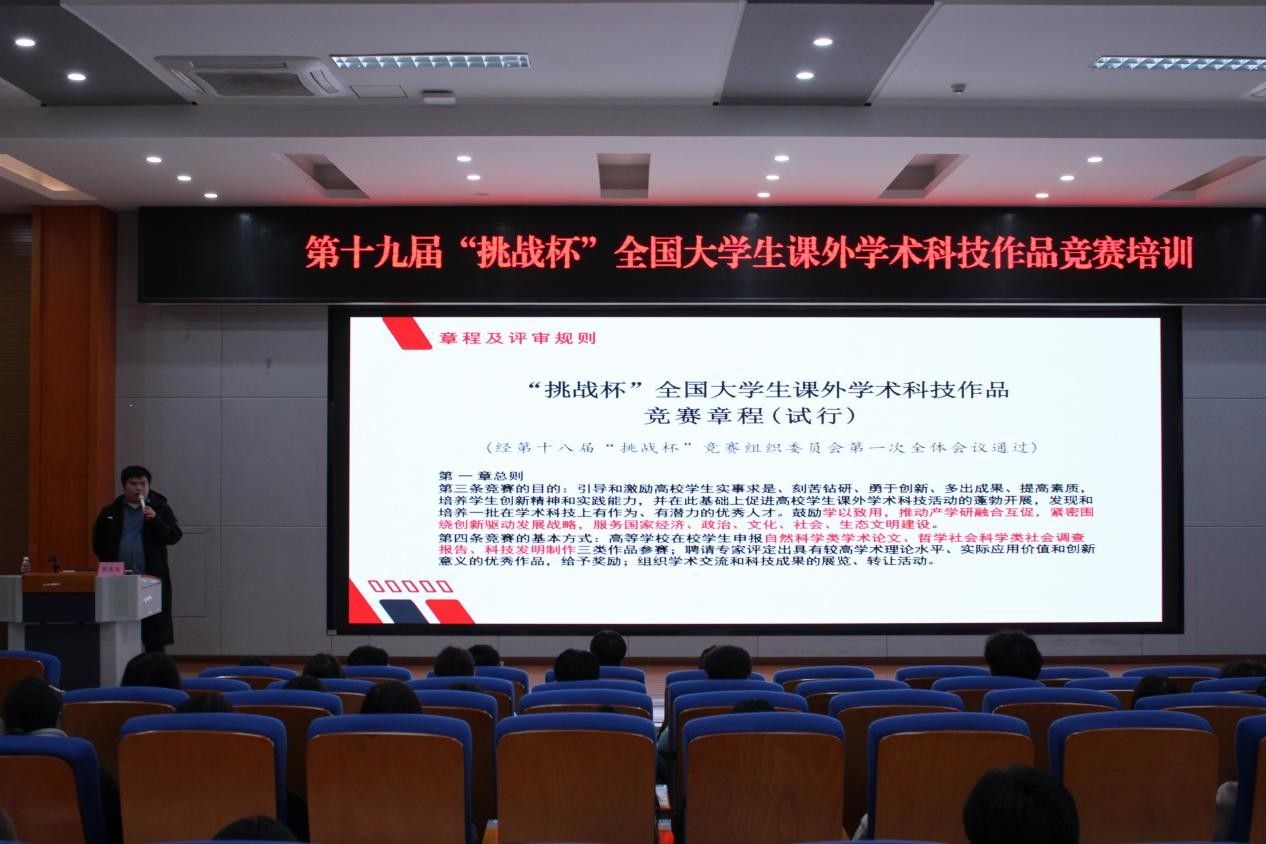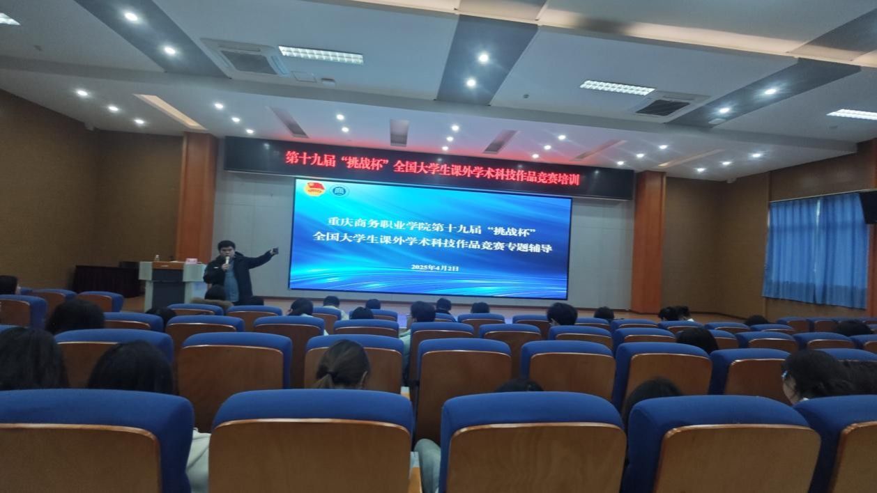 2025年4月2日,我校在第二学术报告厅开展了第十九届“挑战杯”全国大学生课外学术科技作品竞赛专题培训。特邀重庆市资深导师阙易龙来开展专项培训。本次培训聚焦评审规则解读、主体赛事讲解、专题辅导等内容,相关项目指导老师及同学共200余名参与。