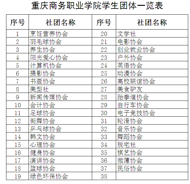 重庆商务职业学院学生团体一览表