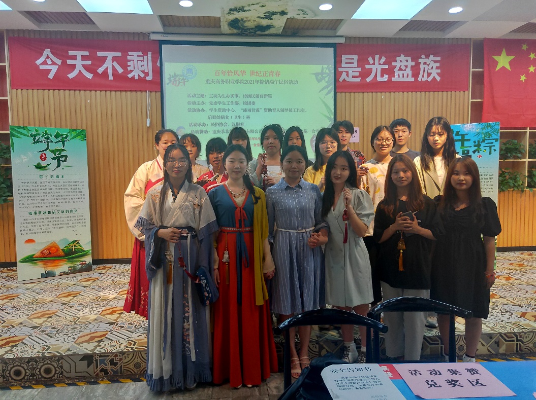 2021年6月10日下午,由党委学工部、校团委主办,学生资助中心、“沛雨甘霖”资助育人辅导员工作室、后勤处膳食(卫生)科协办,民俗协会、汉服社承办,重庆莘莘餐饮管理有限公司赞助的“百年恰风华,世纪正青春”2021年端午节民俗活动在北苑一食堂开展。