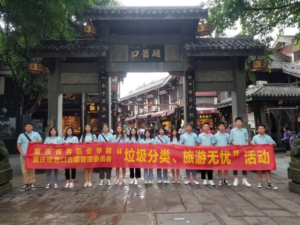 2019年7月,重庆商务职业学院餐饮旅游学院团总支带领17名学生赴沙坪坝区磁器口景区开展了以“小我融入大我,垃圾分类无忧”为主题的社会实践活动,活动采取与磁器口古镇管委会联合的形式开展,倡导景区游客在外也要养成垃圾分类的习惯,提高市民游客对垃圾分类的知晓率和参与率,最终活动顺利完成并收到景区游客良好的反馈。