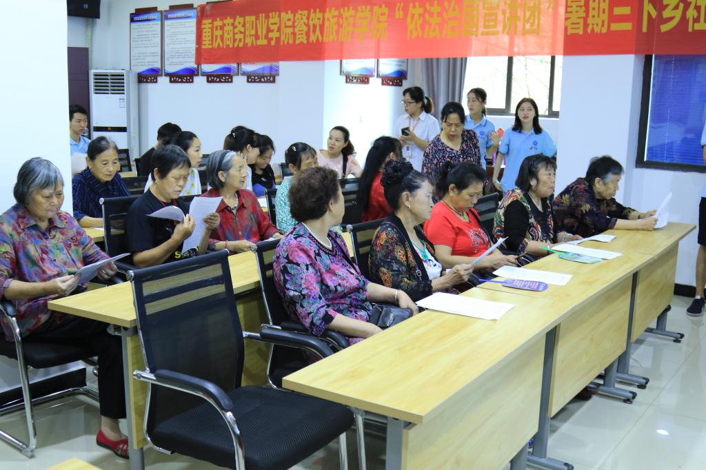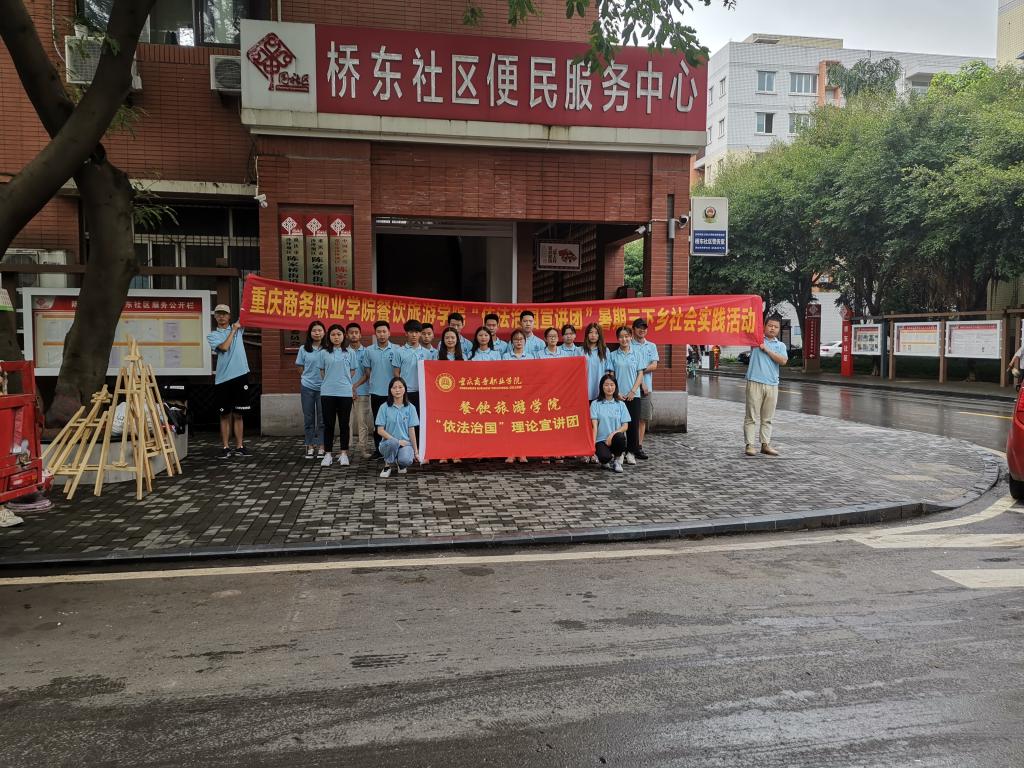 骄阳熠熠,五彩生辉,2019年7月9日,在近一个月紧锣密鼓的筹备与计划后,重庆商务职业学院餐饮旅游学院的26名学生组建“普法宣传,激扬青春”依法治国宣讲团,踏上了前往陈家桥桥东社区的旅程,本次三下乡的活动主题是“弘扬法治教育,构建和谐社会”,旨在全面贯彻落实《中共重庆市委重庆市人民政府关于打赢打好脱贫攻坚战三年行动的实施意见》和《共青团投身打赢脱贫攻坚战三年行动的意见》精神。